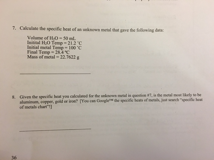 What i did first is try to find δe: If you have problems with the units, feel free to use our temperature conversion or weight conversion calculators. In physics, 'specific' means 'per unit mass'. Mass = = 15.0 g; (make sure to use the heat given off by the metal, the mass of the metal, and the temperature change of the metal in this calculation.)